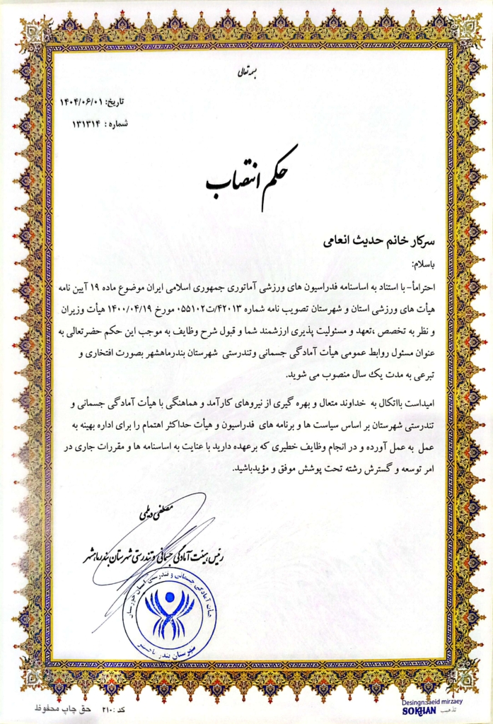 مسئول روابط عمومی هیأت آمادگی جسمانی و تندرستی بندرماهشهر منصوب شد