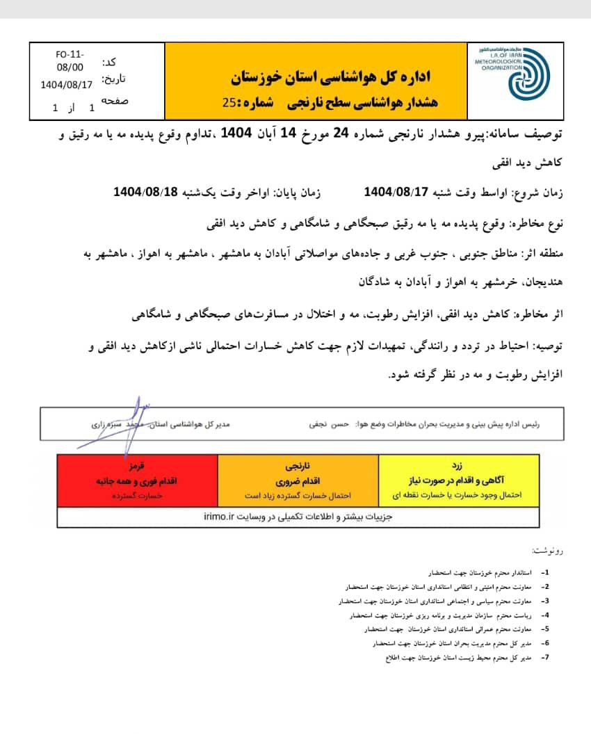 هشدار نارنجی وقوع مه و کاهش دید در خوزستان/ قابل توجه HSE منطقه ویژه و فرمانداری شهرستان بندرماهشهر